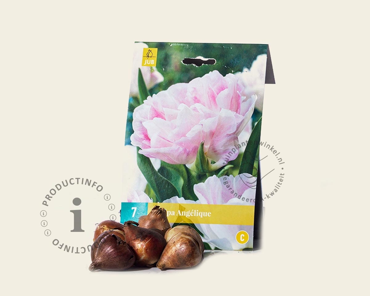 Zeer fraaie en vooral stevige dubbelbloemige tulp met lichtroze bloemen die mooi combineren met wit-bloeiende en blauw bloeiende voorjaarsbloeiers. De bloemen van de Tulipa 'Angelique' staan op vrij lage stelen en vallen niet zo snel om. Deze dubbelbloemige tulp heeft een bijna roosachtige bloemvorm.