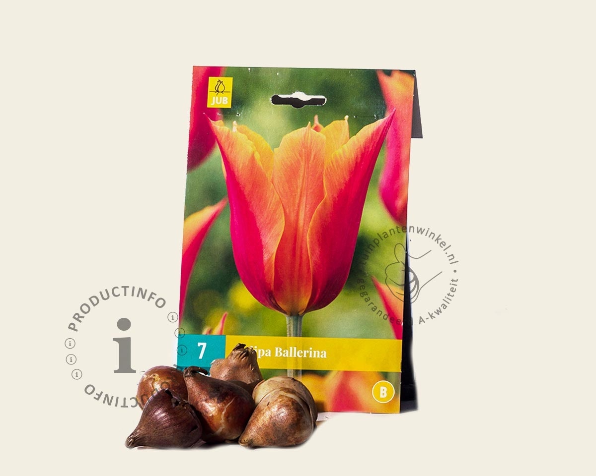 Tulipa 'Ballerina' is een mooie en betrouwbare leliebloemige tulp met een meerjarige bloei in een warme oranje tint; het is een elegante plant. De buitenzijde van de bloembladeren hebben een iets rodere nerf. De bloemen van deze prachtige tulp lopen uit in een lichtgebogen punt. De blijven lang mooi en combineren prachtig met blauw bloeiende bloembollen zoals het Blauwe druifje of Camassia. Of zet ze in een bloempot op een opvallende plek in de voortuin. Geheid dat u met deze oranje bloeiende Tulipa 'Ballerina' succes hebt op Koningsdag!