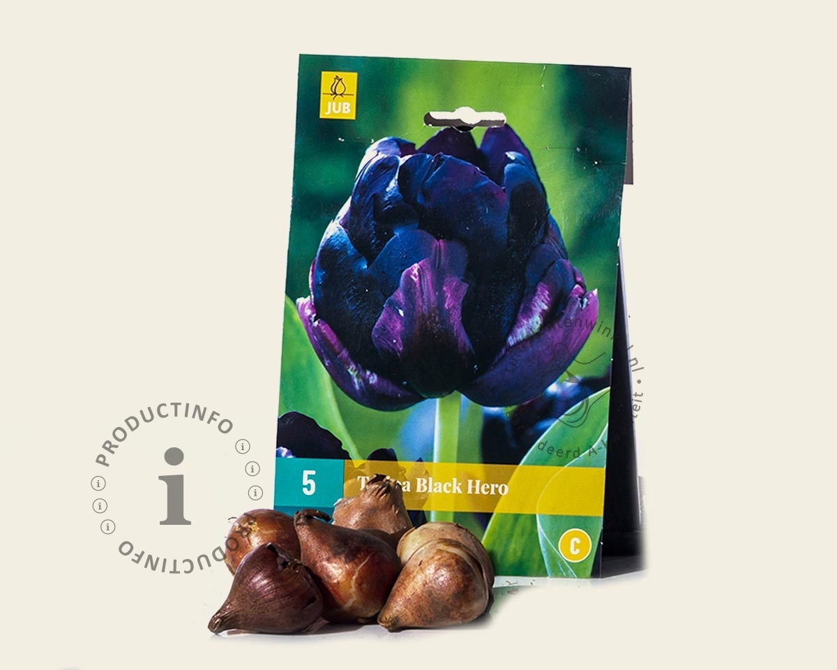 De Tulipa 'Black Hero' is een dubbelbloemige versie van de populaire tulp Queen of the Night'; een zeer donker gekleurde tulp dus. Wanneer de zon op de bloemen zie je dat de bloembladeren eigenlijk zeer donker purperrood gekleurd zijn. Bijna zwart dus! In combinatie met een lichtbloemige voorjaarsbol, komt de kleur het beste tot zijn recht. De Tulipa 'White Triumphator' zou hiervoor een goede optie kunnen zijn.