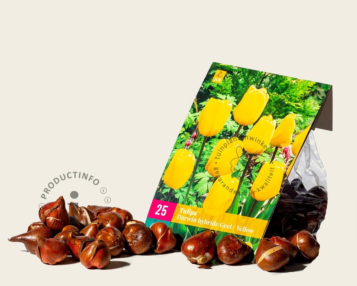 De Tulp is voor Nederland het meest belangrijke bolgewas. De Nederlandse tulpenteelt en -veredeling is wereldberoemd. Er zijn 1000en soorten tulpen. Tuinplantenwinkel biedt een assortiment aan van sterke soorten die opvallen door hun kleur of bloeiwijze. Deze prachtige geelbloeiende tulp is er eentje uit de Darwin-groep. Darwintulpen kenmerken zich door hun opvallend grote, klassiek gevormde, enkele bloemen.