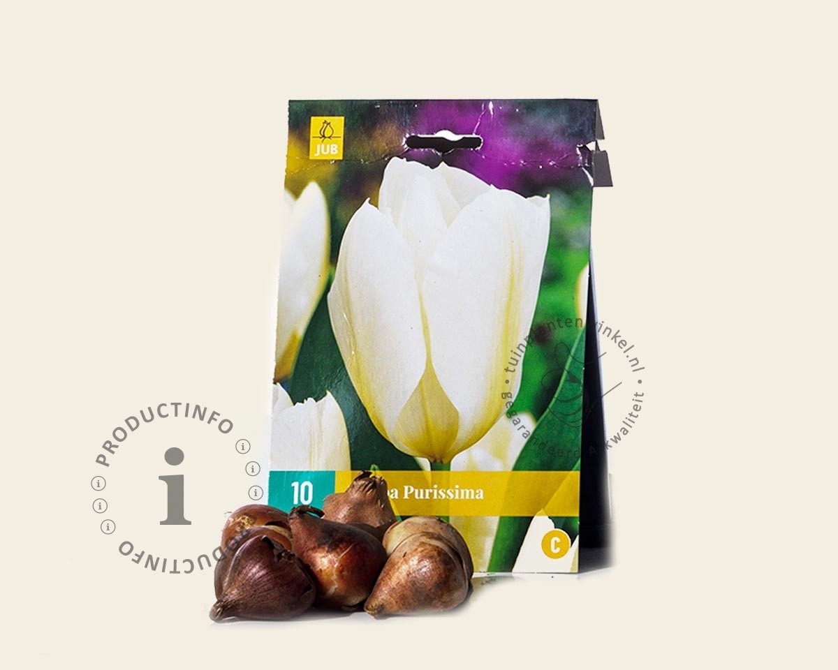 Bloembollen worden in de herfst en begin van de winter aangeplant. Let op dat u de Tulipa fosteriana 'Purissima' tijdig bestelt, want ze zijn maar een beperkte periode leverbaar. Plantdiepte van deze bloembol is ongeveer 10 cm onder de grond. (vanaf de onderkant van de bloembol gemeten). Tulpen kunnen beter iets dieper gezet worden, dan te ondiep. Dit beschermt ze tegen kou in de winter en uitdroging in droge en warme zomers.