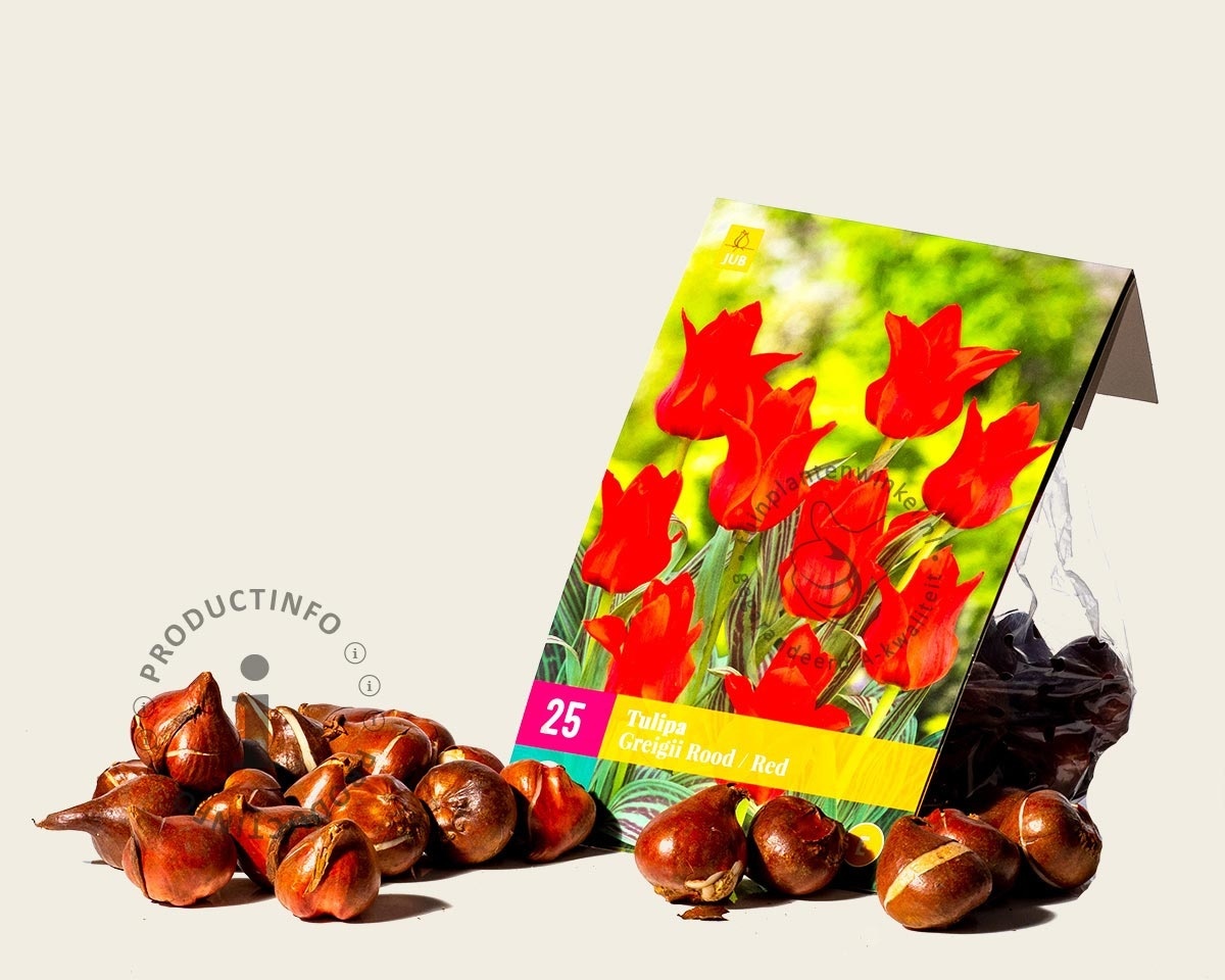 Bloembollen worden in de herfst en begin van de winter aangeplant. Let op dat u de Tulipa greigii Rood tijdig bestelt, want ze zijn maar een beperkte periode leverbaar. Plantdiepte van deze bloembol is ongeveer 10 cm onder de grond. (vanaf de onderkant van de bloembol gemeten). Tulpen kunnen beter iets dieper gezet worden, dan te ondiep. Dit beschermt ze tegen kou in de winter en uitdroging in droge en warme zomers.