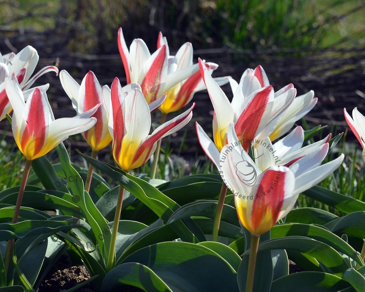 Zeer vroeg bloeiende lage Botanische tulp met bijna witte bloemen waarvan de buitenzijde rood gekleurd is. In de avond en nacht hebben de bloemen een rode kleur maar bij zonneschijn is de witte binnenzijde prachtig zichtbaar evenals de heldergele meeldraden. Vanwege de vorm van de bloemen wordt deze tulp ook wel de waterlelietulp genoemd.