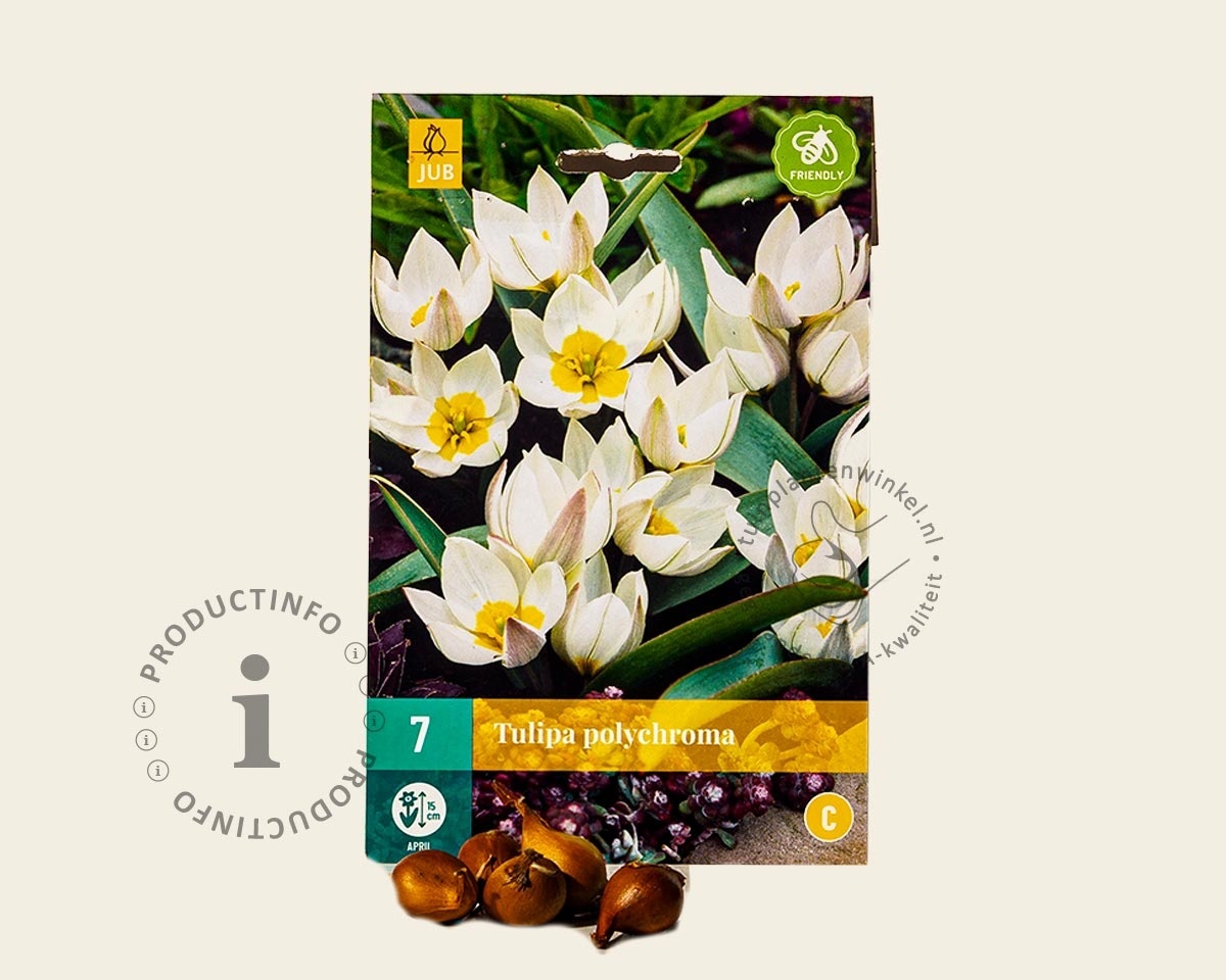 Dit prachtige kleine tulpje genaamd Tulipa polychroma (ook wel bekend onder de naam Tulipa biflora) is zeer geschikt voor verwildering. De bloemkleur is wit en geel (vandaar ook de naam biflora). De bloemblaadjes zijn geel in het hart en wit aan de rand. Als de bloemen zich openen is het heldergele hart goed zichtbaar. Deze Botanische tulp heeft weinig loof en is grijs/groen van kleur. Uit dit loof ontspringen vaak meerdere bloemen. De bloembladeren hebben aan de buitenzijde een groen/purperkleurige blos.