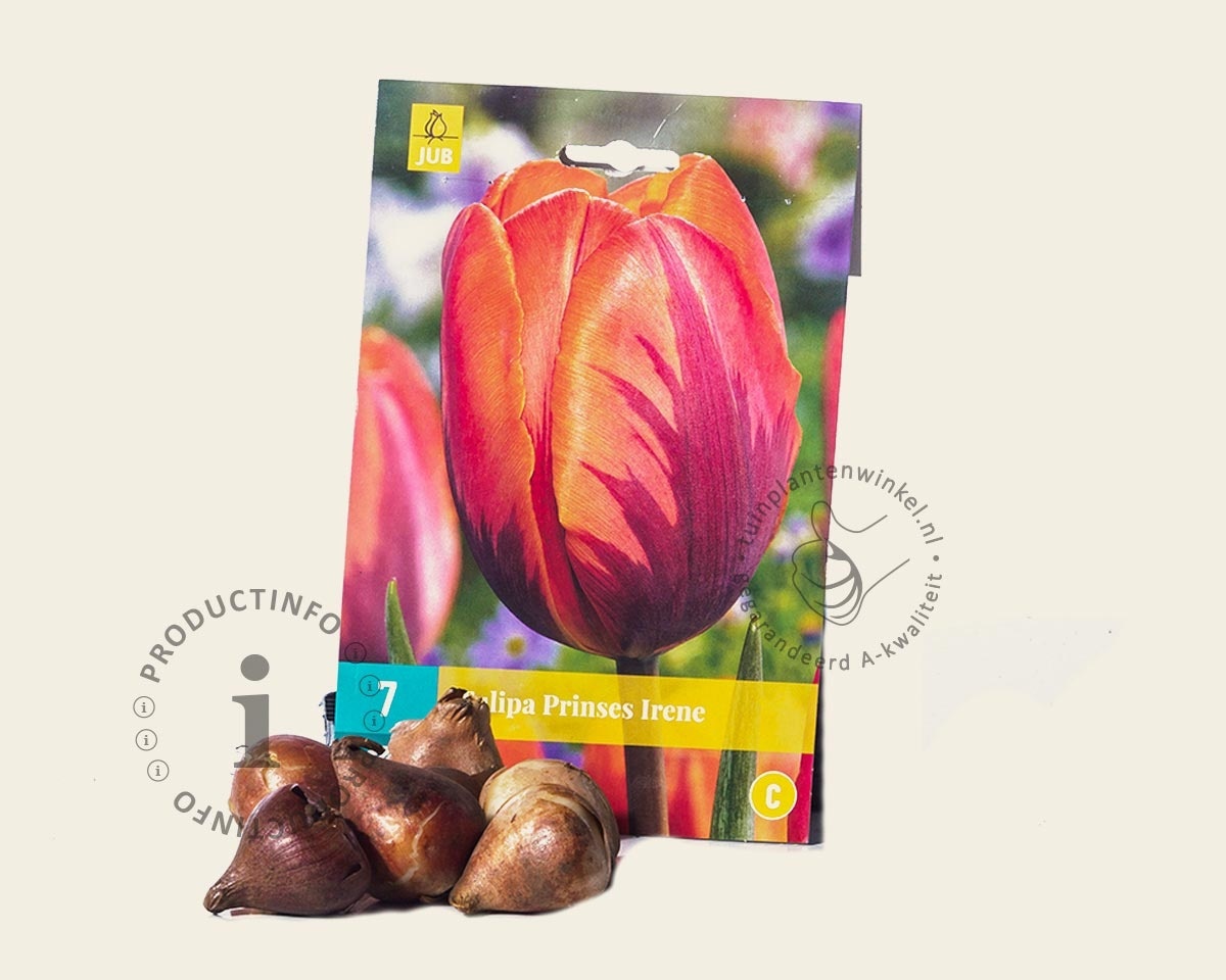 De voornamen van leden van het Koninklijk huis worden vaak gebruikt om tulpen een naam te geven. Ook bij deze tulp is dit het geval. Prinses Irene kan met recht trots zijn op de naar haar vernoemde tulp uit de Tiumph groep. Allereerst hebben de bloemen de klassieke tulpvorm. De werkelijk prachtige, bijna gloeiende, oranje kleur ervan wordt geflankeerd door een paarsachtige tekening. Het verhaal gaat dat deze tekening is gebaseerd op het symbool van Canada, het esdoornblad. Prinses Irene woonde tijdens de Tweede Wereldoorlog in Canada.