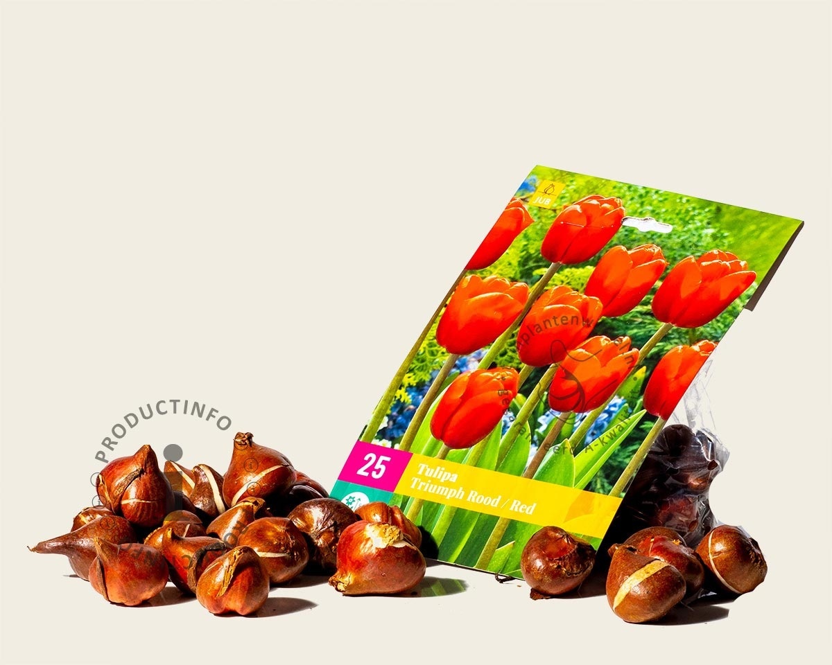 Bloembollen worden in de herfst en begin van de winter aangeplant. Let op dat u de Tulipa triumph Rood tijdig bestelt, want ze zijn maar een beperkte periode leverbaar. Plantdiepte van deze bloembol is ongeveer 10 cm onder de grond. (vanaf de onderkant van de bloembol gemeten). Tulpen kunnen beter iets dieper gezet worden, dan te ondiep. Dit beschermt ze tegen kou in de winter en uitdroging in droge en warme zomers.