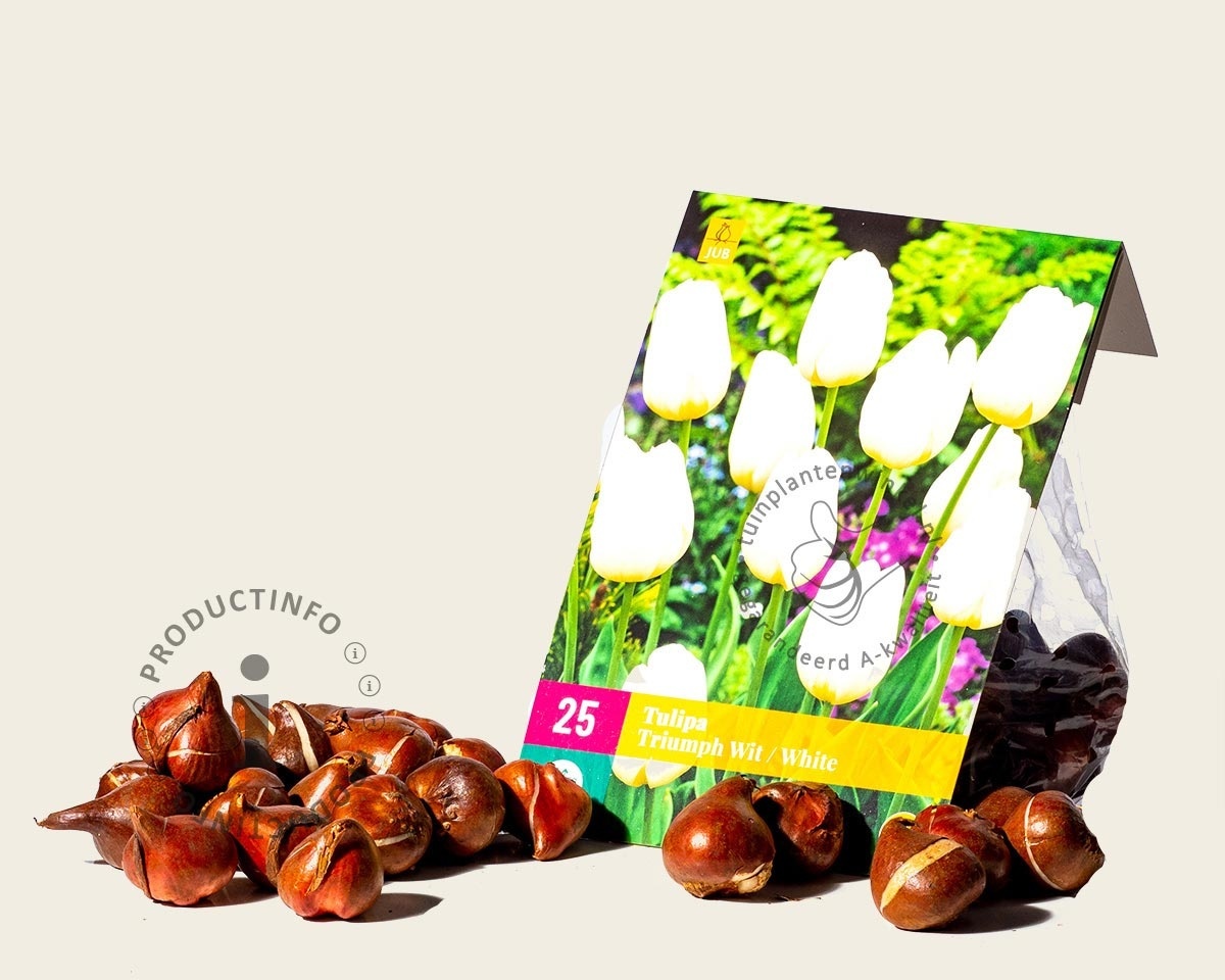De Tulp is voor Nederland het meest belangrijke bolgewas. De Nederlandse tulpenteelt en -veredeling is wereldberoemd. Er zijn 1000en soorten tulpen. Tuinplantenwinkel biedt een assortiment aan van sterke soorten die opvallen door hun kleur of bloeiwijze. Deze prachtig zuiverwit bloeiende tulp komt uit de Triumph-groep. Triumph tulpen kenmerken zich door hun klassiek gevormde, enkele ovale bloemen die op een sterke stengel staan.