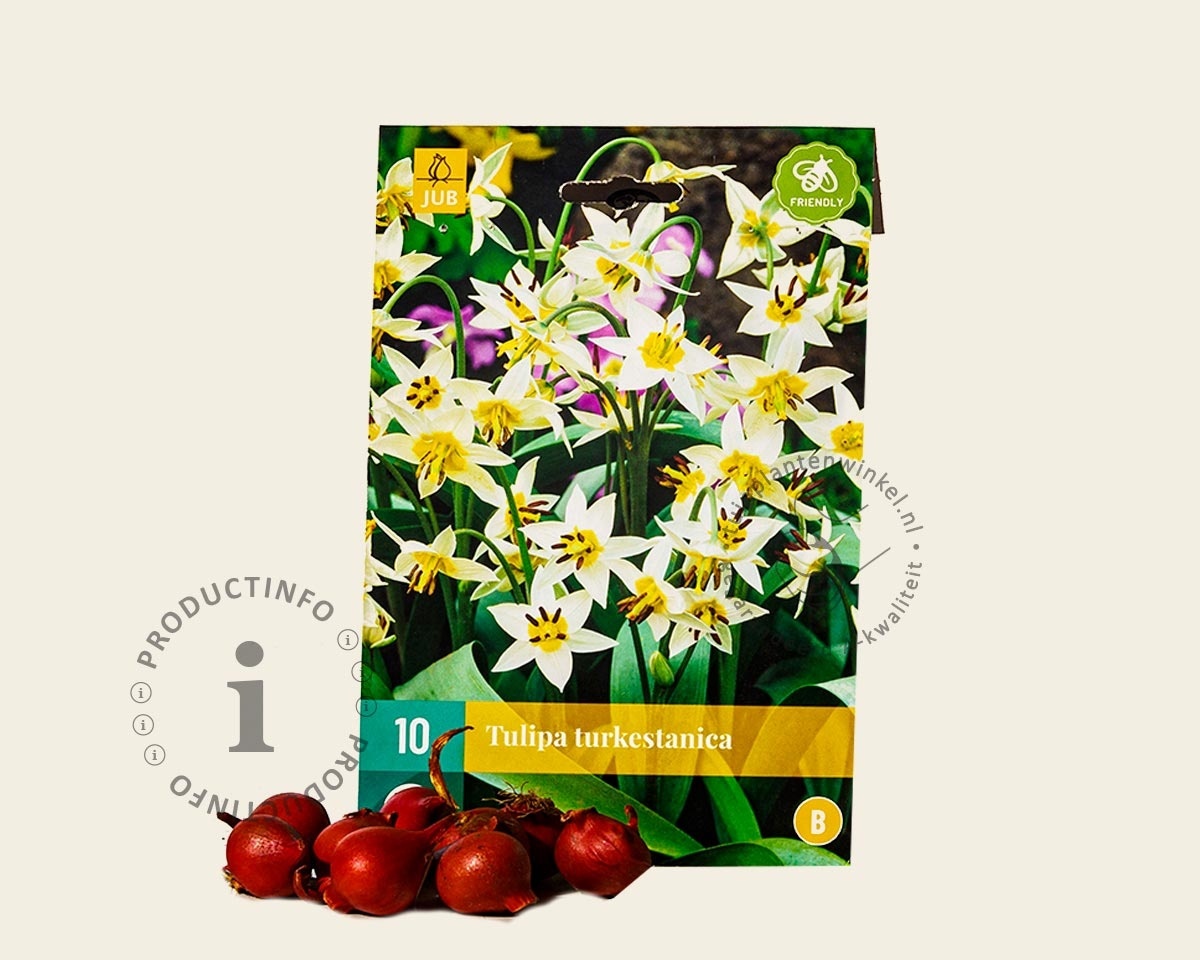 Tulp Tulipa turkestanica heeft grijsgroen blad en daar boven uit komen de witte bloemen die een geel hart hebben. De bloemen verschijnen in maart april. Zet de tulpen van deze soort in de zon tot halfschaduw. Plantafstand tussen de bollen is 5 tot 10 cm.