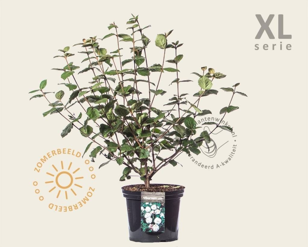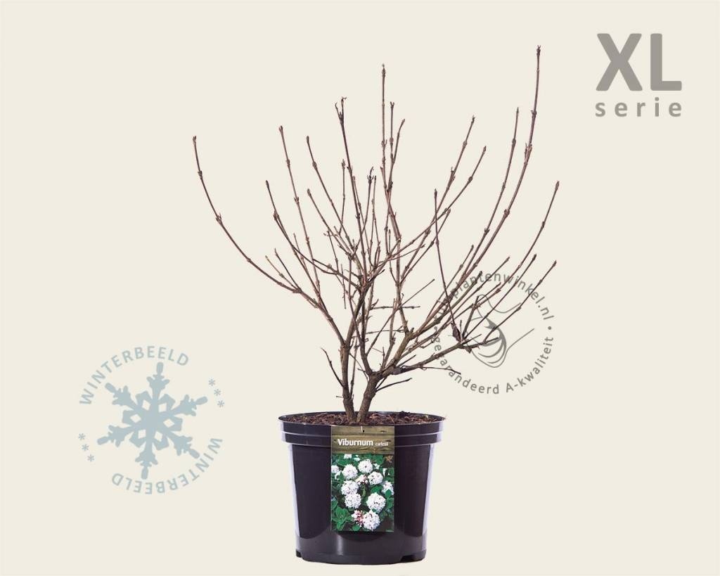 Viburnum carlesii - XL wordt ongeveer 1,5 meter hoog en is daardoor ook geschikt voor kleinere tuinen. De tuinplant bloeit in mei met grote, bolvormige, witte, geurende bloemen, die later in het seizoen uitgroeien tot blauwpaarse bessen. Viburnum carlesii is een winterharde, maar bladverliezende tuinplant met een mooie, oranjerode herfstverkleuring.