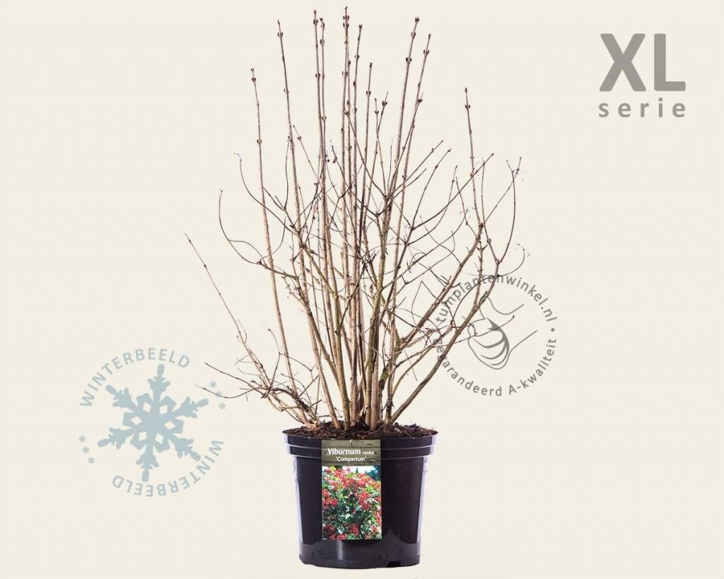Viburnum opulus 'Compactum' - XL is het hele jaar door een mooie tuinplant en geliefd bij de vogels. De compacte groeiwijze van de Gelderse roos maakt hem ook geschikt als haagplant. Opvallend zijn de witte bloemschermen, met kleine, vruchtbare bloemetjes in het midden, waar in het najaar de rode besjes uit voortkomen, met daar omheen aan de rand de grotere, onvruchtbare bloemen, die heerlijk ruiken. De besjes zijn een lekkernij voor de vogels. De nectar is geliefd bij bijen. De Gelderse roos is een inheemse plant. Dat betekent dat we de tuinplant ook in de vrije natuur in vochtige gebieden tegen kunnen komen.