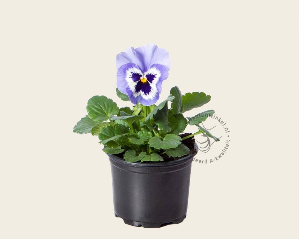 Grootbloemige winterviolen verschijnen in vele kleuren. Deze bloeit met blauw-witte kroonbladeren. Het hart of oog van de bloem is diepblauw van kleur. Dit viooltje bloeit gedurende de hele winter. Bij vorst beschermt de plant zichzelf door plat op de grond te gaan liggen. Wanneer de temperatuur boven het vriespunt stijgt staat het viooltje weer fier overeind. De bloei duurt voort tot diep in het voorjaar. Afhankelijk van de temperatuur blijft dit éénjarig plantje mooi tot eind april - juni.