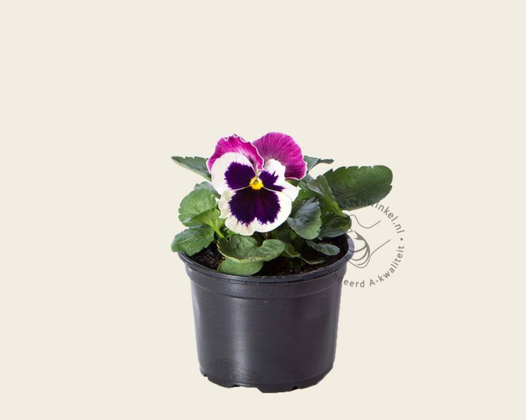 Grootbloemige winterviolen verschijnen in vele kleuren. Deze bloeit met witte en cassis-kleurige kroonbladeren. Het hart van de bloem heeft een dieppaarse tekening. Dit viooltje bloeit gedurende de hele winter. Bij vorst beschermt de plant zichzelf door plat op de grond te gaan liggen. Wanneer de temperatuur boven het vriespunt stijgt staat het viooltje weer fier overeind. De bloei duurt voort tot diep in het voorjaar. Afhankelijk van de temperatuur blijft dit éénjarig plantje mooi tot eind april - juni.