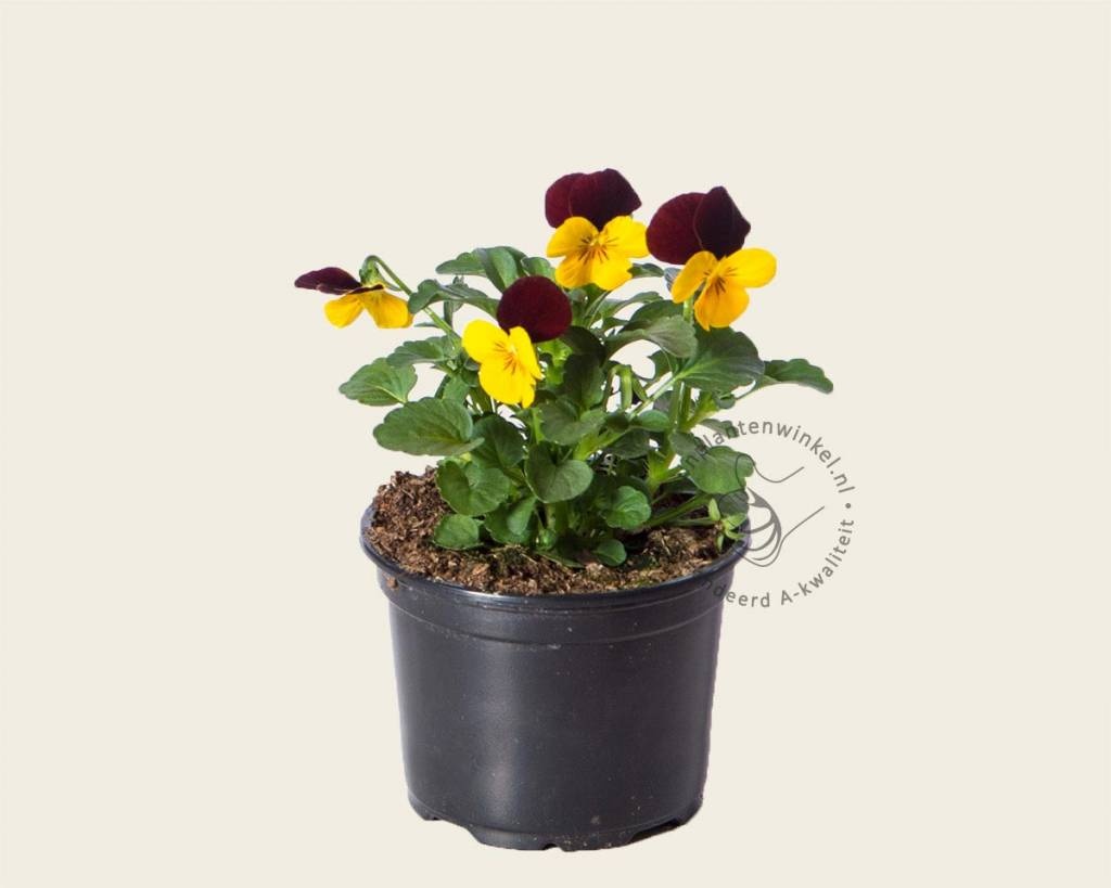 Viool Mini Rood-Geel - met oog is een éénjarige najaars-/voorjaarsbloeier. Dit miniviooltje bloeit van oktober t/m mei met rood - gele bloemen met oog, wordt uiteindelijk ongeveer 10 cm hoog en staat bij voorkeur in de zon - halfschaduw.
