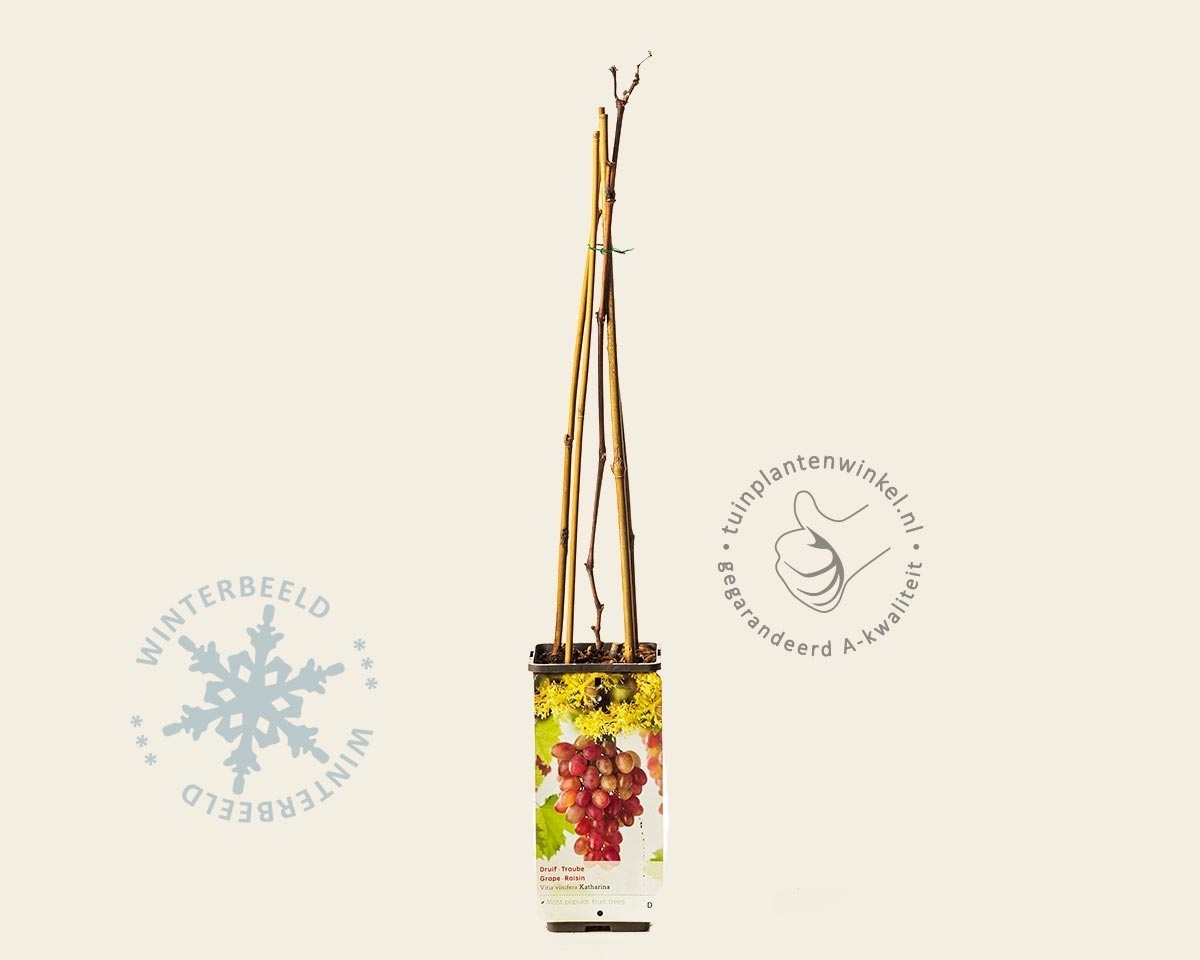 Deze aparte druivelaar geeft lichtrode of roze vruchten in het najaar. Vitis vinifera 'Katherina' is vanwege haar vruchtkleur een opvallende verschijning tussen de druiven. De druiven smaken zoet tot lichtzuur. Naast de vruchten, zorgen de bladeren voor sierwaarde in de tuin. Bij het uitlopen hebben deze een rood aangelopen kleur.