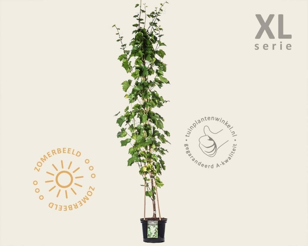 Vitis vinifera 'Vroege van der Laan' - XL is een van de best rijpende en lekkere, witte druiven in het Belgische/Nederlandse klimaat. Een synoniem voor deze druif is de 'Weisser Boskoop'. De tuinplant staat het liefst op een warme, zonnige, beschutte plaats en bloeit in april-mei met onopvallende, geelgroene trosjes bloemen. Na de bloei van Vitis vinifera 'Vroege van der Laan' komt er een overvloed van nieuwe scheuten. Laat alleen de sterke scheuten van de tuinplant staan en knip zwakke en vormverstorende takken helemaal weg. Krenten van deze Druif is niet noodzakelijk. Laat ook de vruchtdragende takken niet te lang worden en verwijder in de nazomer de bladeren rond de trossen voor een betere rijping. Vanaf eind augustus kan er geoogst worden.