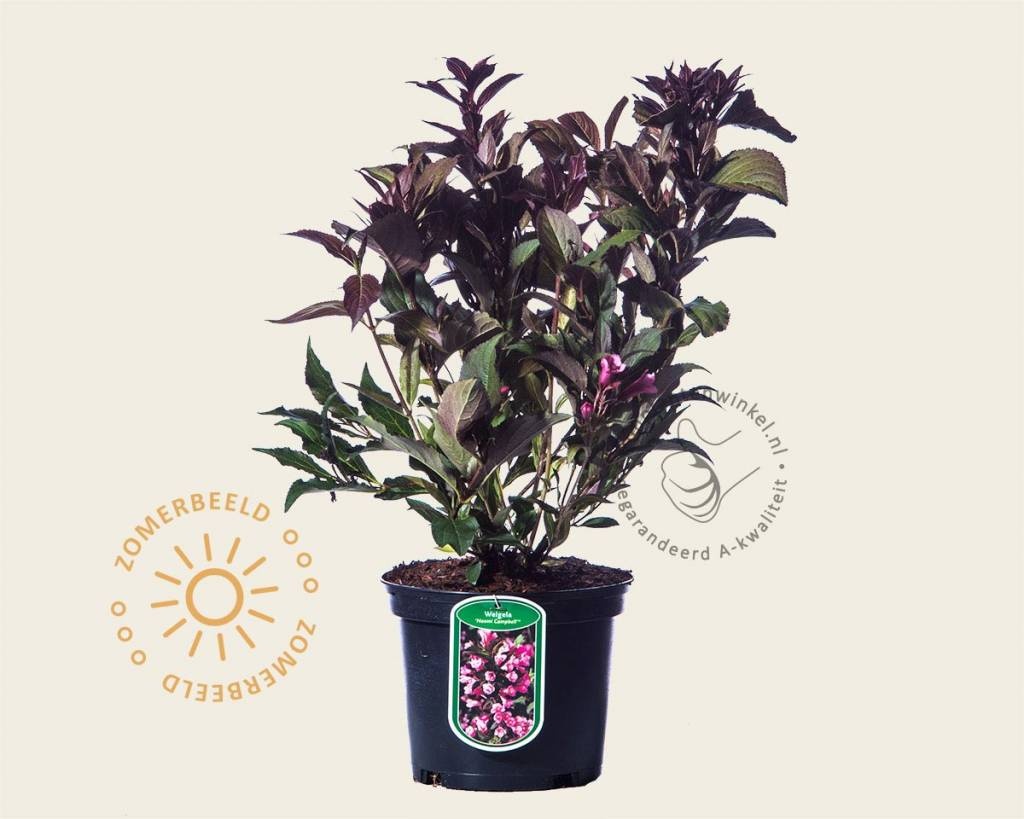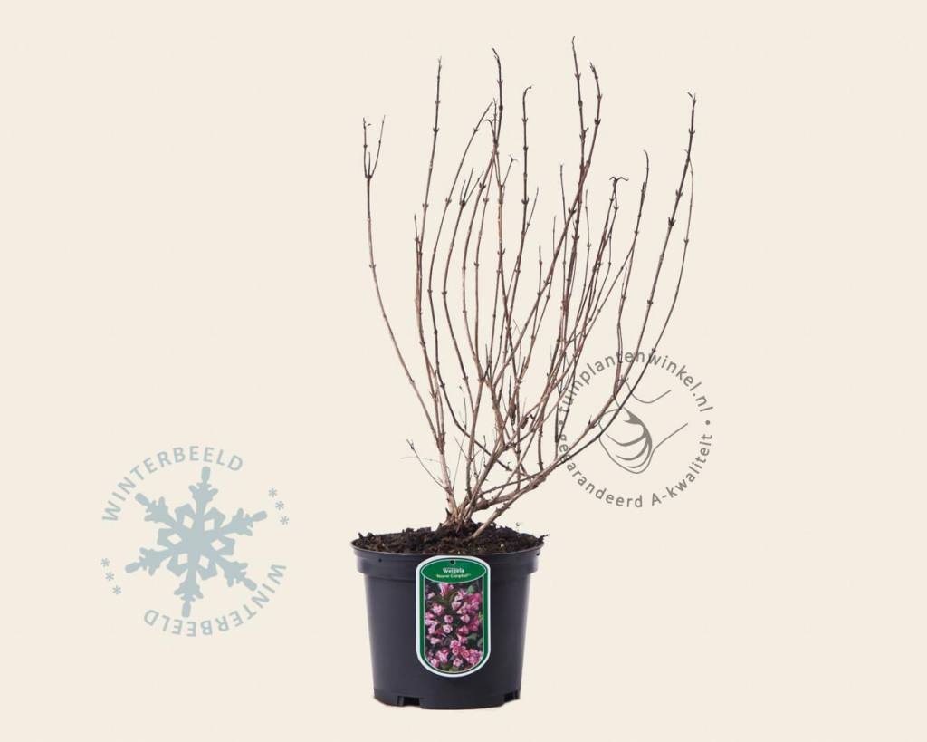Weigela 'Naomi Campbell' krijgt van mei-juni mooie, dieproze bloemen; hoe meer zon, hoe uitbundiger de bloei. De bladeren van de tuinplant zijn purper van kleur en zorgen samen met de bloemen voor een prachtig gekleurde heester. Weigela 'Naomi Campbell' is geschikt als solitair achter in de border maar ook als losse haag of groepsbeplanting. De tuinplant is bladverliezend en winterhard.
