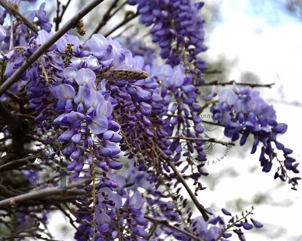 De bloemen verschijnen in trossen aan de blauwe regen, Wisteria. Een geënte blauweregen zal binnen een paar jaar gaan bloeien. Dit in tegenstelling toe een 'wilde' variant van de blauwe regen, Wisteria, waar de eerst bloei soms pas na vele jaren aan de struiken verschijnt. De blauwe regen, Wisteria is een klimmer, die zelfs kan uitgroeien tot een boom.